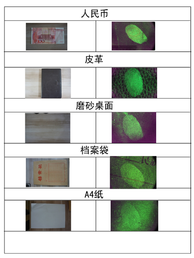 现粗糙表面上的指纹。由于红外光是不可见光,复杂背景呈黑色,背景完全被滤除。适合于显现复杂背景上的指纹。